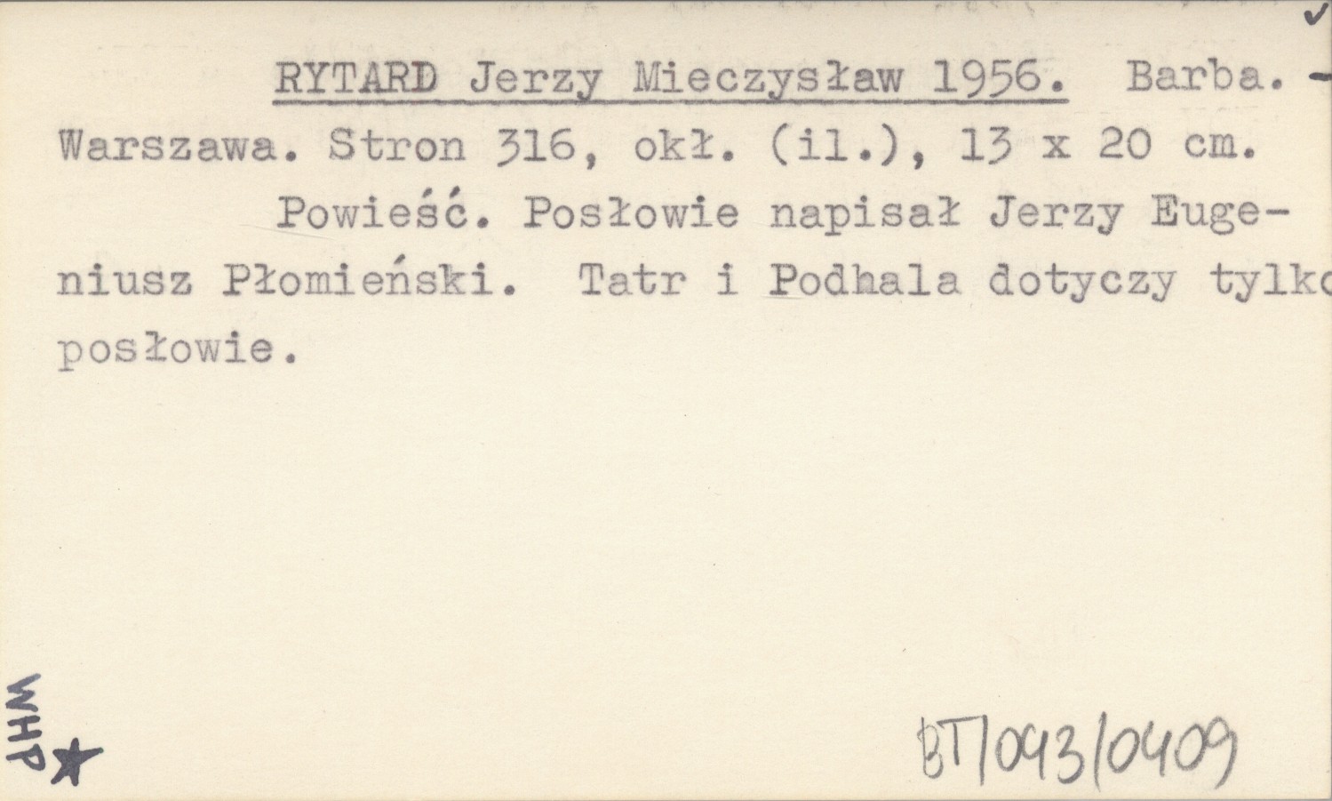 Warszawa , 316 s., okł. (il.), 13x20 cm. Powieść. Posłowie napisał Jerzy Eugeniusz Płomieński. Tatr i Podhala dotyczy tylko posłowie.