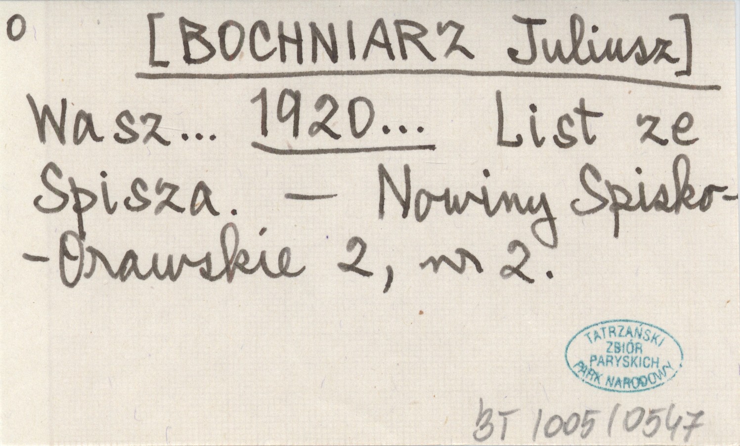 Wasz... [BOCHNIARZ Juliusz] 1920... List ze Spisza.