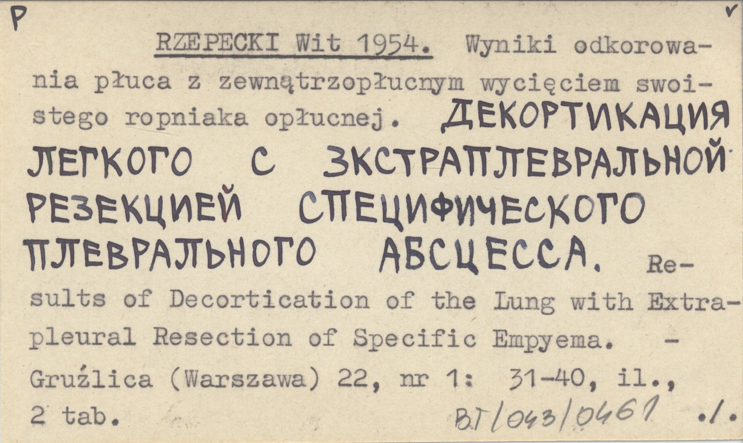 RZEPECKI Wit 1954 Wyniki odkorowania płuca z zewnątrzopłucnym wycięciem swoistego ropniaka opłucnej. Dekortikacija legkogo s ekstraplevral'noj rezekciej specifičeskogo plevral'nogo abscessa. Results of Decortication of the Lung with Extrapleural Resection of Specific Empyema.