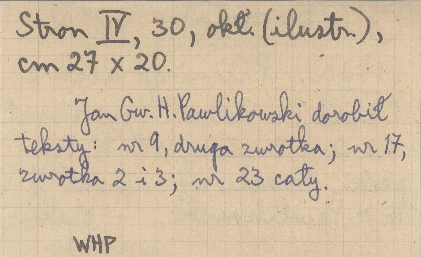 Kraków , IV s., 30 s., okł. (il.), 27x20 cm. Jan Gw. H. Pawlikowski dorobił teksty: nr 9, druga zwrotka; nr 17, zwrotka 2 i 3; nr 23 cały.
