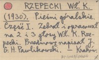RZEPECKI Wł. K. (1930) Pieśni góralskie. Część I. Zebrał i opracował na 2 i 3 głosy Wł. K. Rzepecki. Przedmowę napisał J. G. H. Pawlikowski.