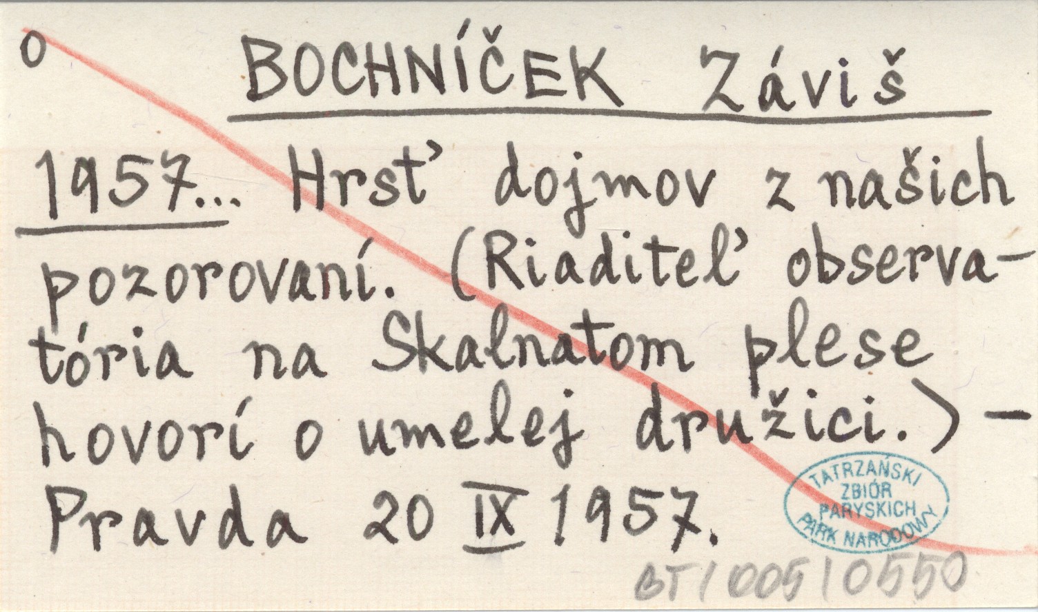 BOCHNÍČEK Záviš 1957... Hrsť dojmov z našich pozorovaní. (Riaditeľ observatória na Skalnatom plese hovorí o umelej družici.).