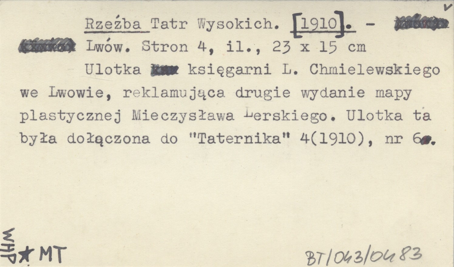 Lwów , 4 s., il., 23x15 cm. Ulotka księgarni L. Chmielewskiego we Lwowie, reklamująca drugie wydanie mapy plastycznej Mieczysława Lerskiego. Ulotka ta była dołączona do "Taternika" 4 (1910), nr 6.