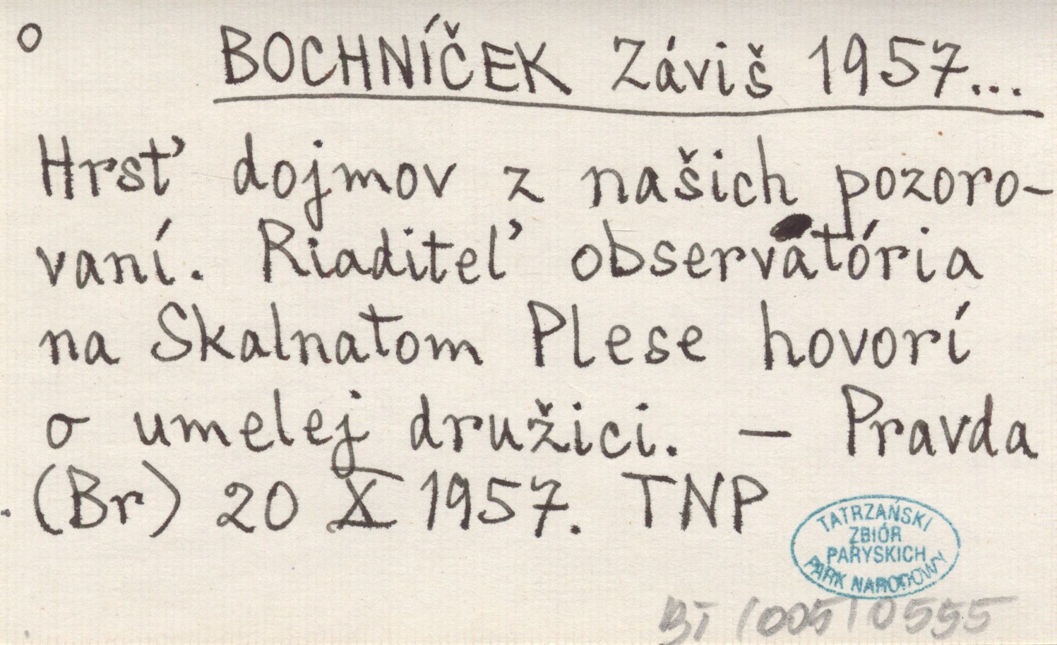 BOCHNÍČEK Záviš 1957... Hrsť dojmov z našich pozorovaní. Riaditeľ observatória na Skalnatom Plese hovorí o umelej družici.