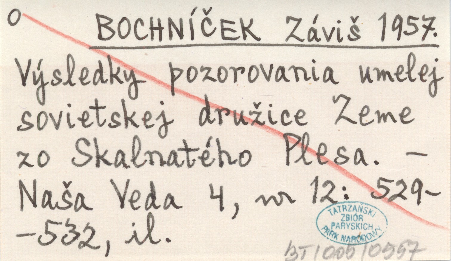 BOCHNÍČEK Záviš 1957 Výsledky pozorovania umelej sovietskej družice Zeme zo Skalnatého Plesa.