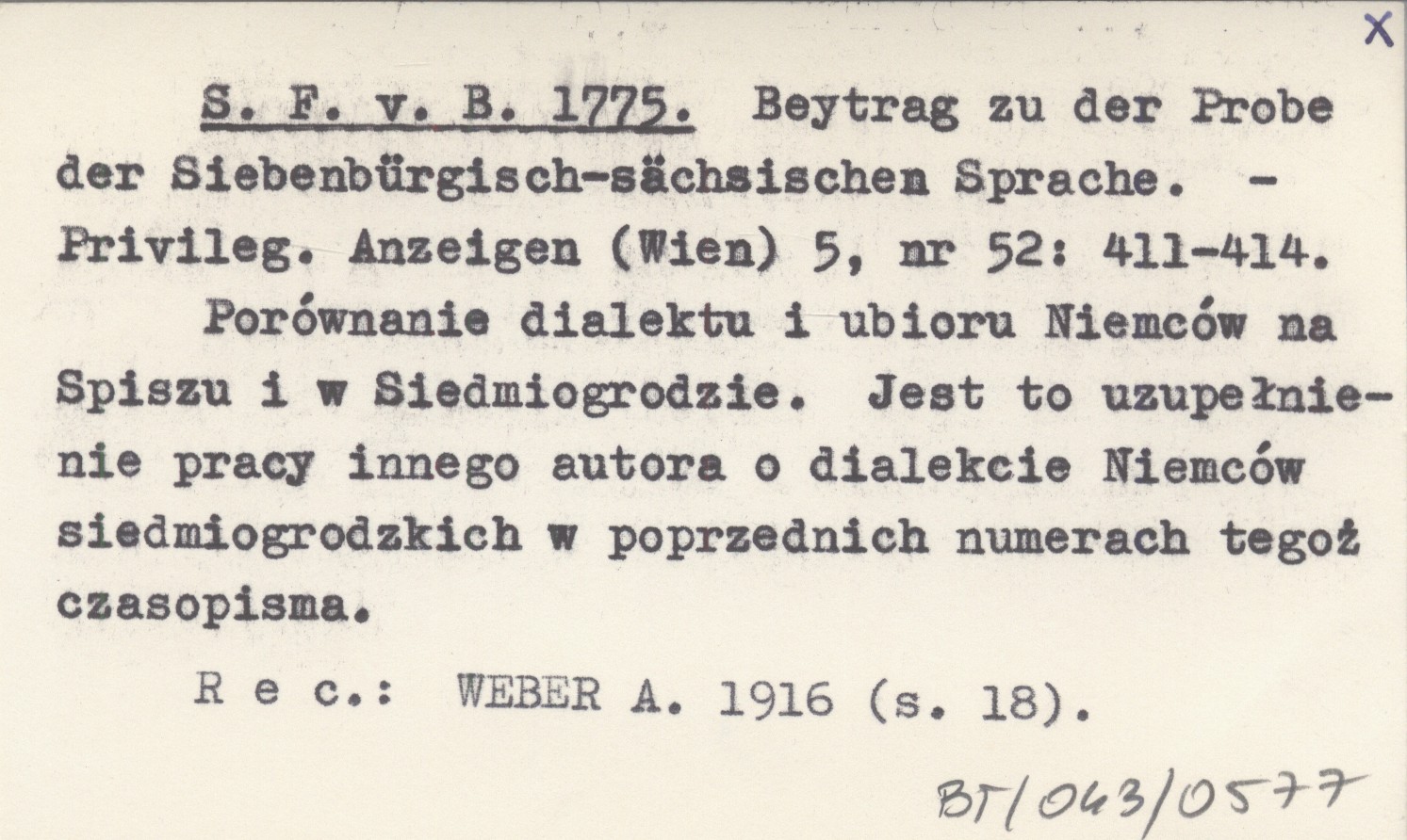 Privileg. Anzeigen (Wien) , 5, nr 52: 411-414. Porównanie dialektu i ubioru Niemców na Spiszu i w Siedmiogrodzie. Jest to uzupełnienie pracy innego autora o dialekcie Niemców siedmiogrodzkich w poprzednich numerach tegoż czasopisma. REC: WEBER A. 1916: 18.