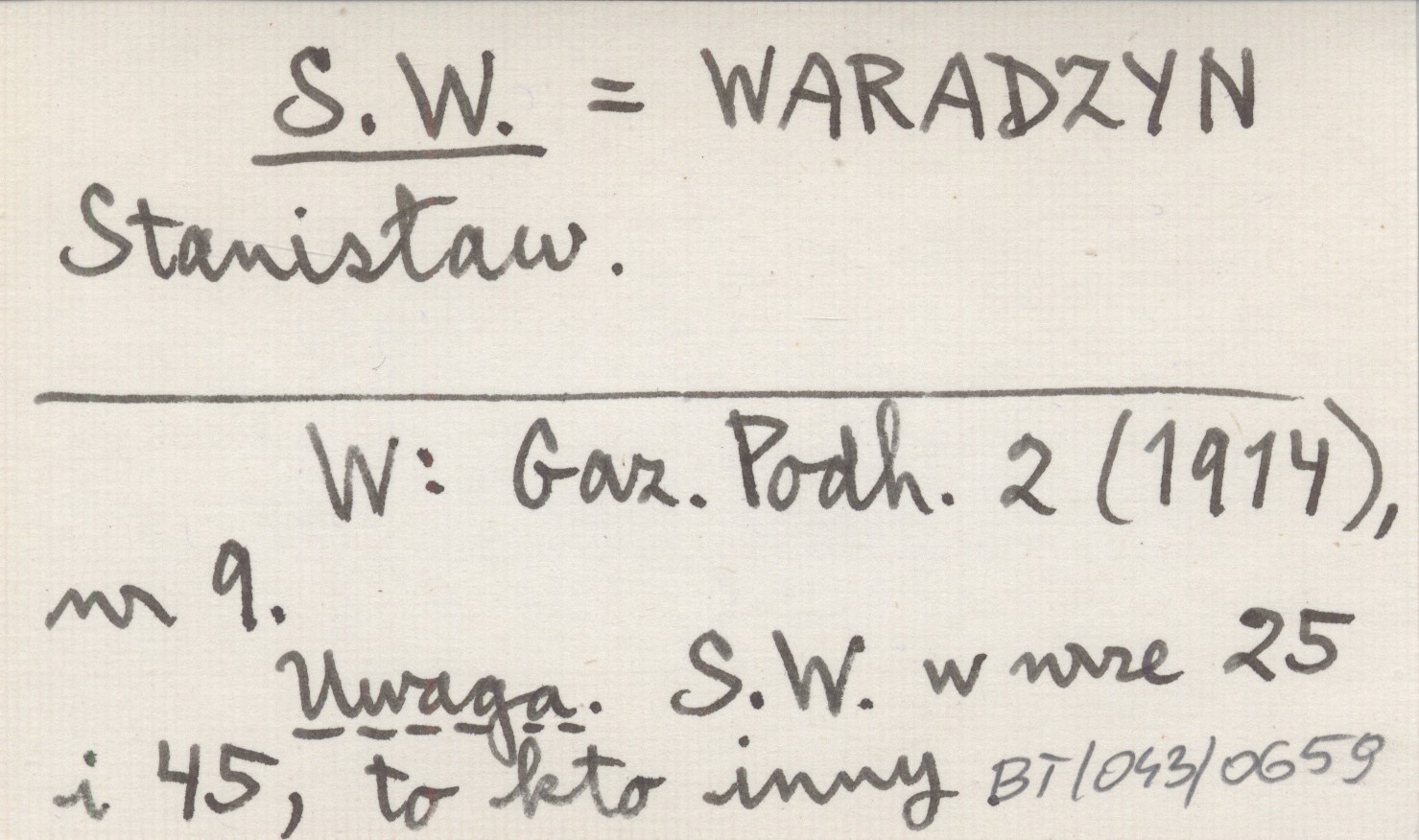 S. W. WARADZYN Stanisław Gazeta Podhalańska 2 (1914), nr 9. S. W. w nr 25 i 45, to kto inny.