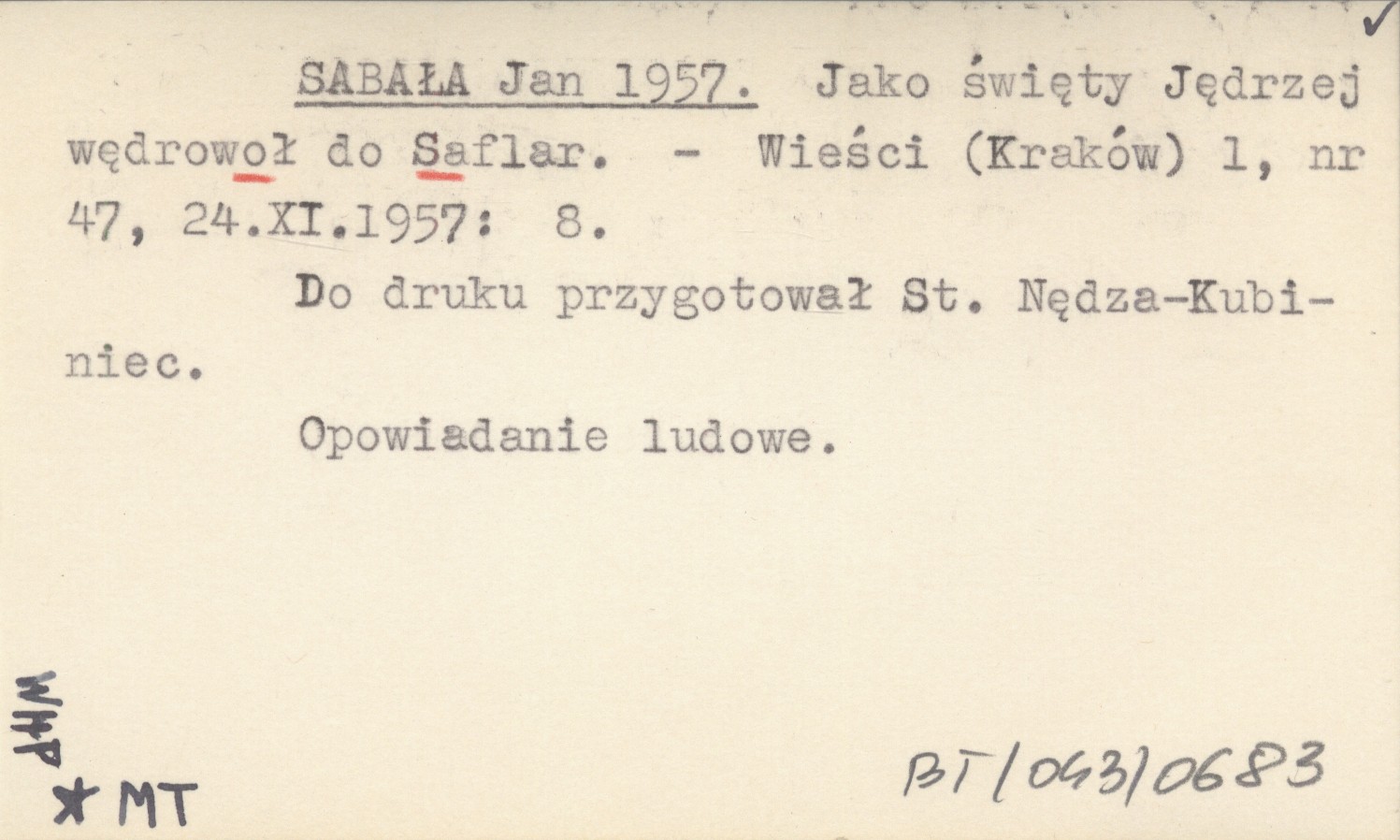 Wieści (Kraków) , 1, nr 47, 24 XI 1957: 8. Opowiadanie ludowe. Do druku przygotował St. Nędza-Kubiniec.