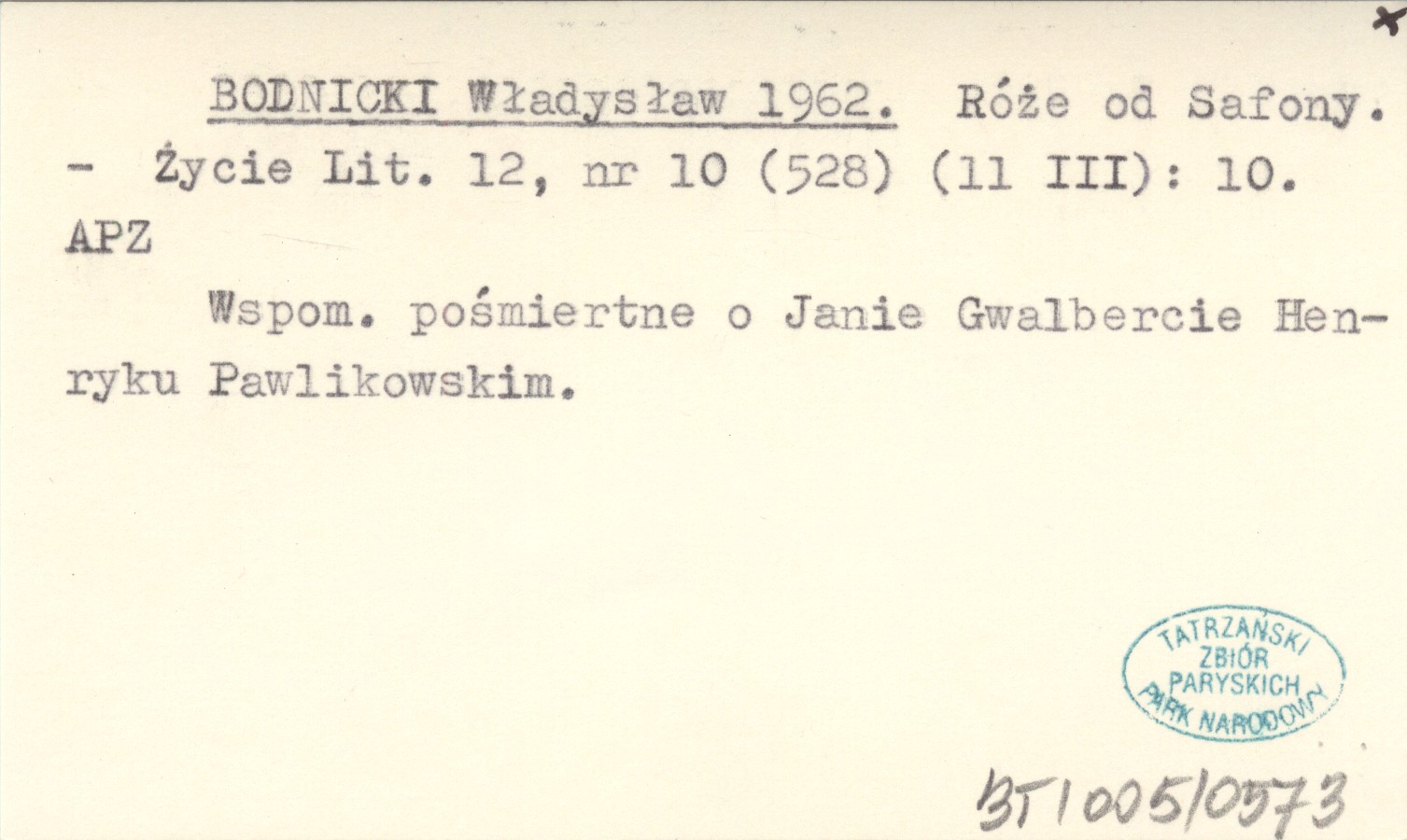 Życie Literackie, 12, nr 10 (528) (11 III): 10. Wspom. pośmiertne o Janie Gwalbercie Henryku Pawlikowskim.