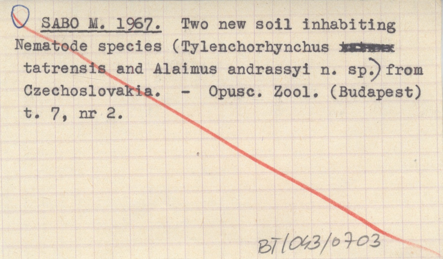 SABO M. 1967 Two new soil inhabiting Nematode species (Tylenchorhynchus tatrensis and Alaimus andrassyi n. sp.) from Czechoslovakia.