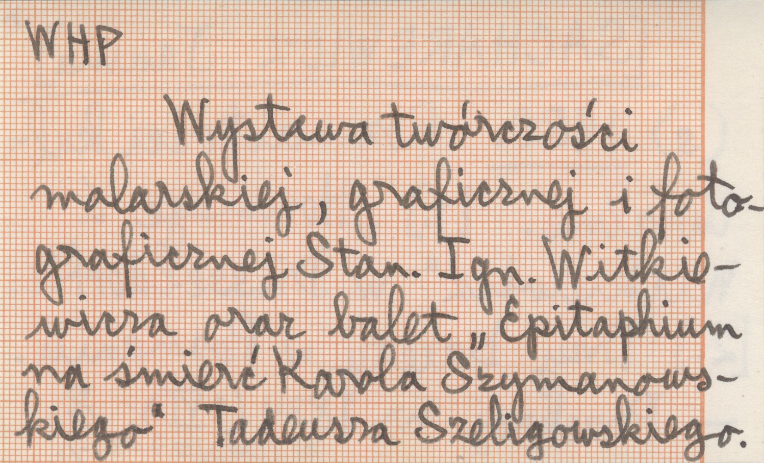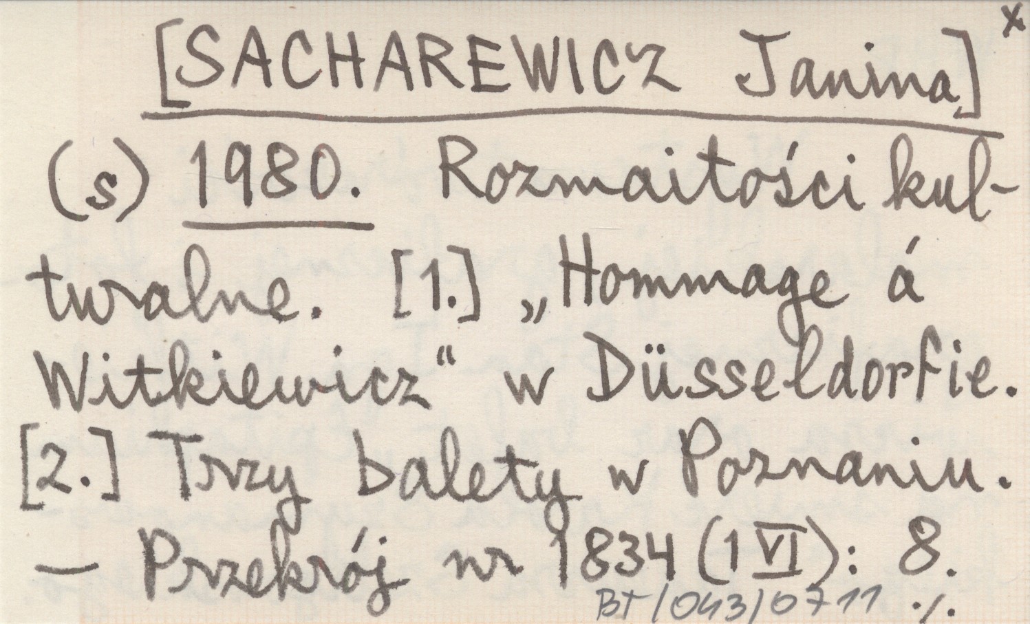 (s) [SACHAREWICZ Janina] 1980 Rozmaitości kulturalne. [1.] "Hommage á Witkiewicz" w Düsseldorfie. [2.] Trzy balety w Poznaniu.