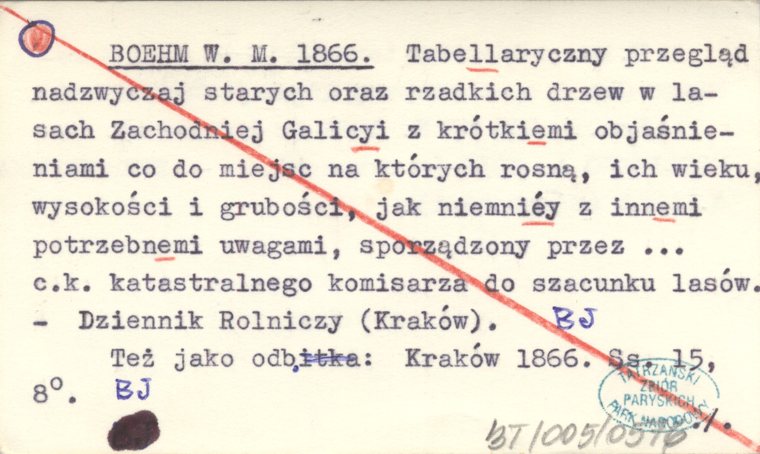 BOEHM W. M. 1866 Tabellaryczny przegląd nadzwyczaj starych oraz rzadkich drzew w lasach Zachodniej Galicyi z krótkiemi objaśnieniami co do miejsc na których rosną, ich wieku, wysokości i grubości, jak niemniéy z innemi potrzebnemi uwagami, sporządzony przez ... c.k. katastralnego komisarza do szacunku lasów.