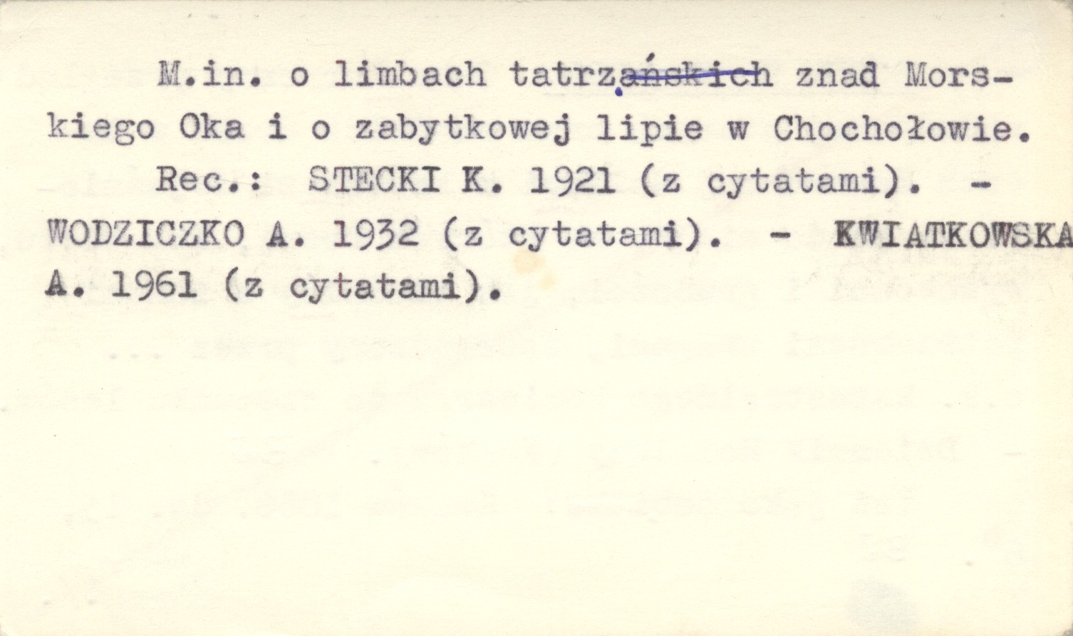 Dziennik Rolniczy (Kraków) , 15 s., 8°. M.in. o limbach tatrz. znad Morskiego Oka i o zabytkowej lipie w Chochołowie. Też jako odb. REC: STECKI K. 1921 (z cytatami). - WODZICZKO A. 1932 (z cytatami). - KWIATKOWSKA A. 1961 (z cytatami).