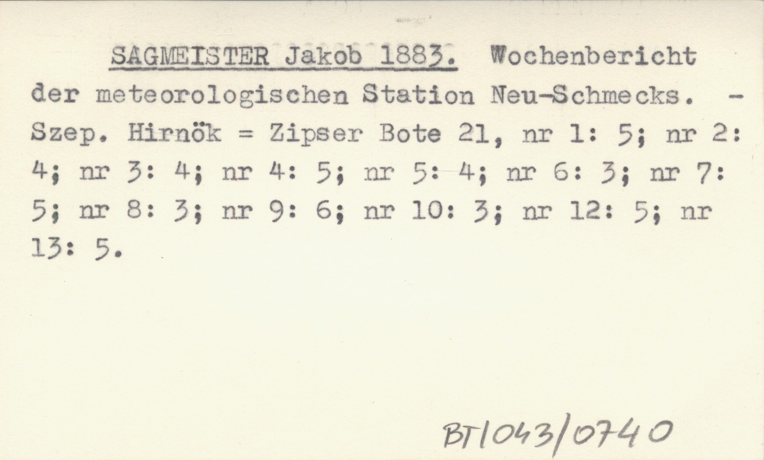 SAGMEISTER Jakob 1883 Wochenbericht der meteorologischen Station Neu-Schmecks.