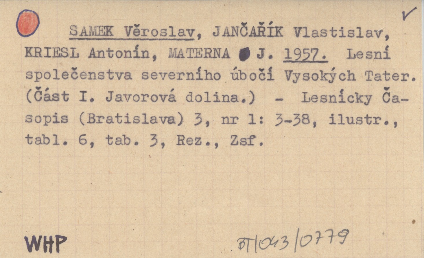 SAMEK Věroslav JANČAŘÍK, Vlastislav. ; KRIESL, Antonín. ; MATERNA, J. ; 1957 Lesní společenstva severního úbočí Vysokých Tater. (Část I. Javorová dolina).