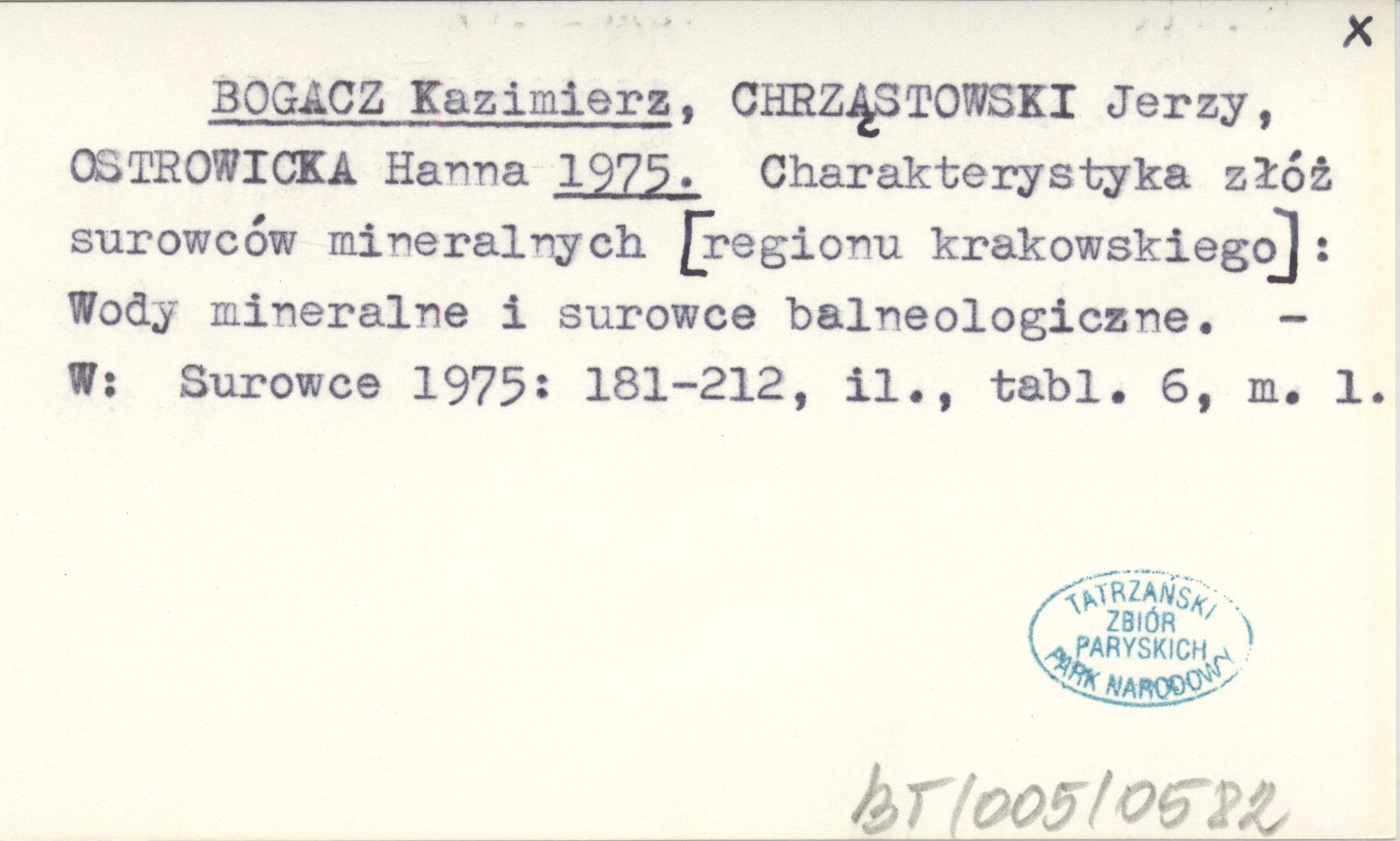 BOGACZ Kazimierz CHRZĄSTOWSKI, Jerzy. ; OSTROWICKA, Hanna. ; 1975 Charakterystyka złóż surowców mineralnych [regionu krakowskiego]: Wody mineralne i surowce balneologiczne.