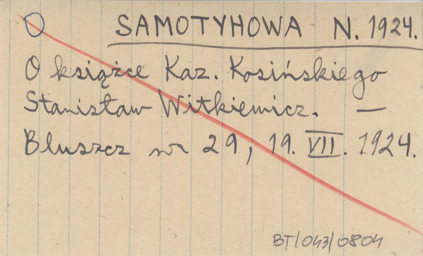 SAMOTYHOWA N. 1924 O książce Kaz. Kosińskiego Stanisław Witkiewicz.