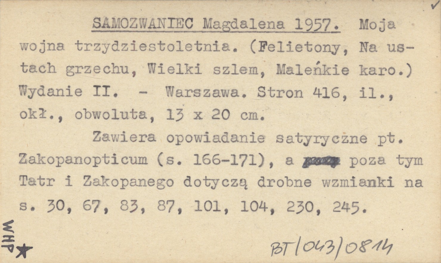 SAMOZWANIEC Magdalena 1957 Moja wojna trzydziestoletnia. (Felietony, Na ustach grzechu, Wielki szlem, Maleńkie karo).