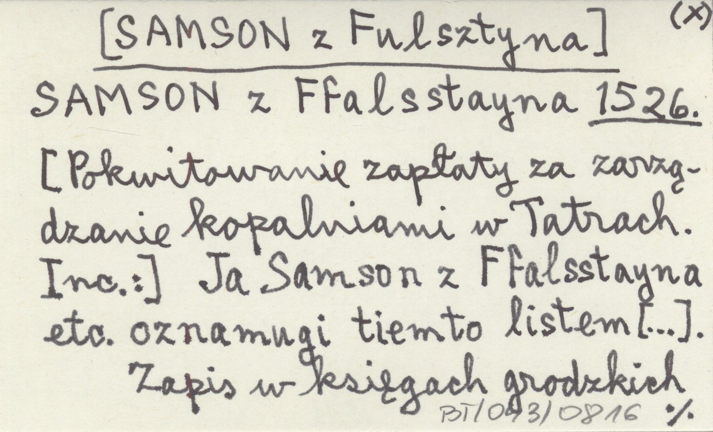 SAMSON z Ffalsstayna [SAMSON z Fulsztyna] 1526 [Pokwitowanie zapłaty za zarządzanie kopalniami w Tatrach. Inc. :] Ja Samson z Ffalsstayna etc. oznamugi tiemto listem [...].