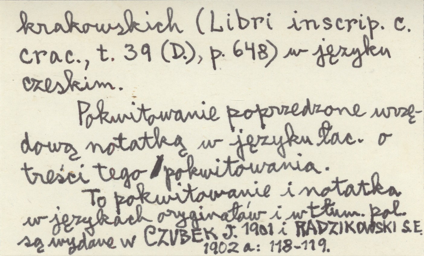 , Zapis w księgach grodzkich krakowskich (Libri inscrip. c. crac., t. 39 (D.), p. 648) w języku czeskim. Pokwitowanie poprzedzone urzędową notatką w języku łac. o treści tego pokwitowania. To pokwitowanie i notatka w językach oryginałów i w tłum. pol. są wydane w CZUBEK J. 1901 i RADZIKOWSKI S. E. 1902 a: 118-119 ; CZUBEK J. 1901 RADZIKOWSKI S. E. 1902 a: 118-119