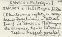 SAMSON z Ffalsstayna [SAMSON z Fulsztyna] 1526 [Pokwitowanie zapłaty za zarządzanie kopalniami w Tatrach. Inc. :] Ja Samson z Ffalsstayna etc. oznamugi tiemto listem [...].
