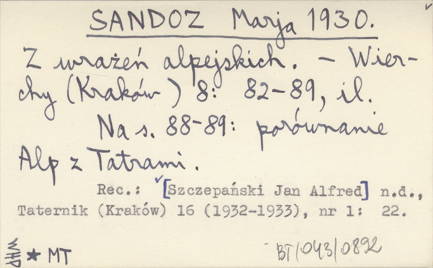 Wierchy (Kraków) , 8: 82-89, il. Na s. 88-89: porównanie Alp z Tatrami. REC: [SZCZEPAŃSKI Jan Alfred] n.d., Taternik (Kraków) 16 (1932-1933), nr 1: 22.