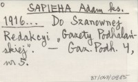 SAPIEHA Adam ks. 1916... Do Szanownej Redakcyi "Gazety Podhalańskiej".