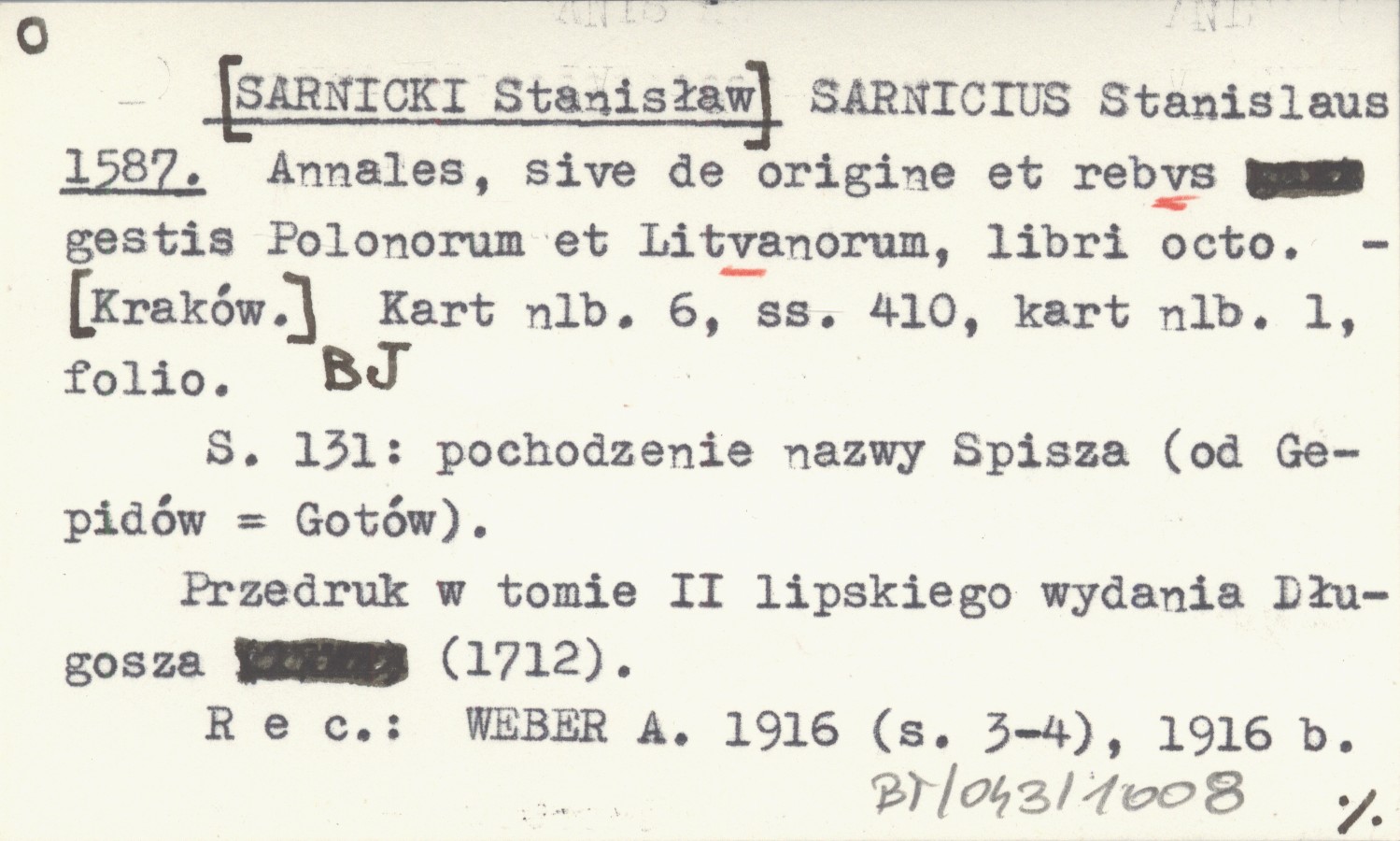 [Kraków] , [6] k., 410 s., [1] k., folio. S. 131: pochodzenie nazwy Spisza (od Gepidów = Gotów). Przedruk w tomie II lipskiego wydania Długosza (1712). REC: WEBER A. 1916 (s. 3-4), 1916 b