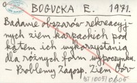 BOGUCKA E. 1971 Badanie obszarów rekreacyjnych ziem karpackich pod kątem ich wykorzystania dla różnych form wypoczynku.