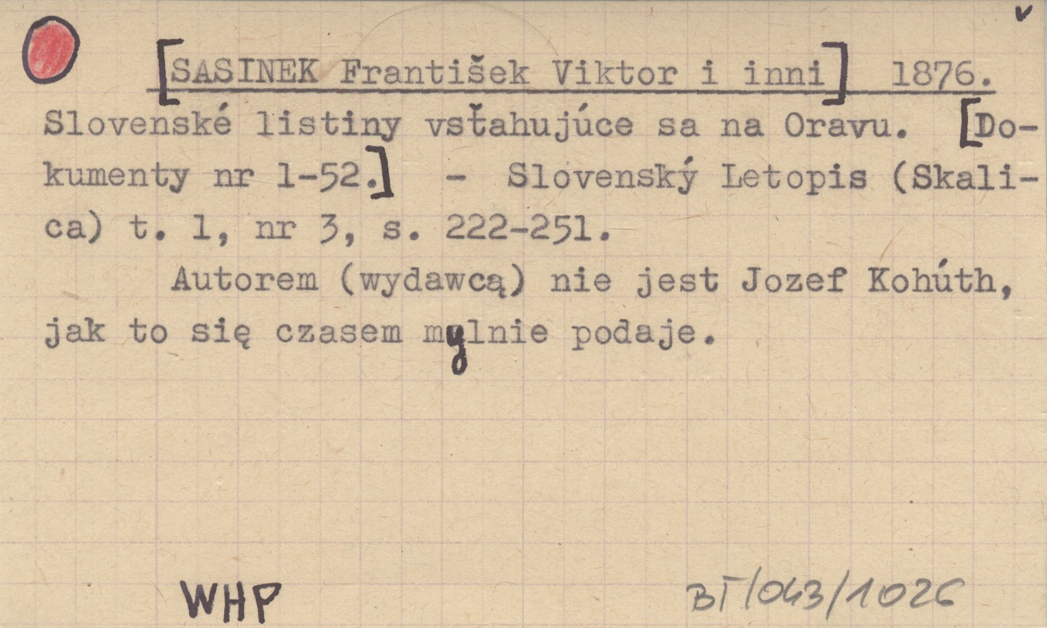 [SASINEK František Viktor i inni] 1876 Slovenské listiny vsťahujúce sa na Oravu. [Dokumenty nr 1-52].