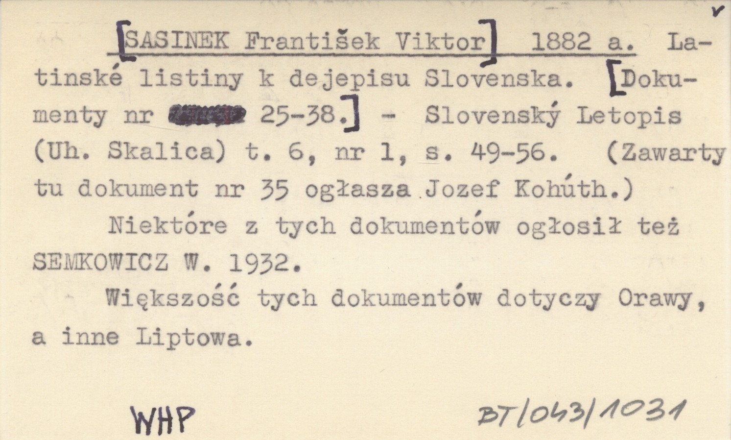 Slovenský Letopis (Uh. Skalica) , T. 6, nr 1: 49-56. Większość tych dokumentów dotyczy Orawy, a inne Liptowa. Zawarty tu dokument nr 35 ogłasza Jozef Kohúth. Niektóre z tych dokumentów ogłosił też SEMKOWICZ W. 1932.