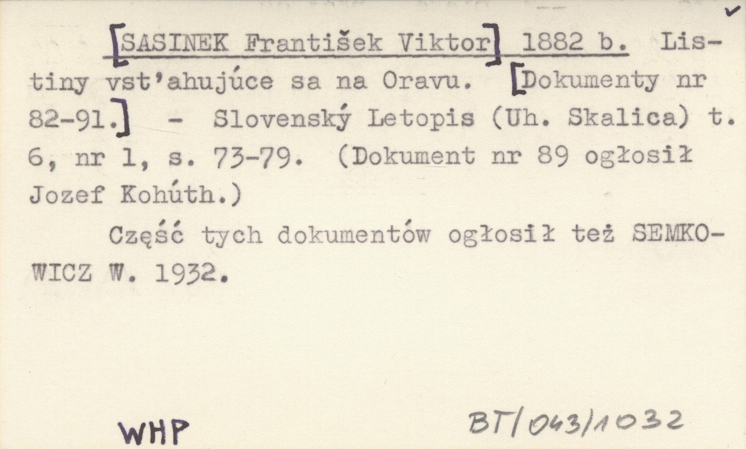 [SASINEK František Viktor] 1882 b Listiny vsťahujúce sa na Oravu. [Dokumenty nr 82-91].
