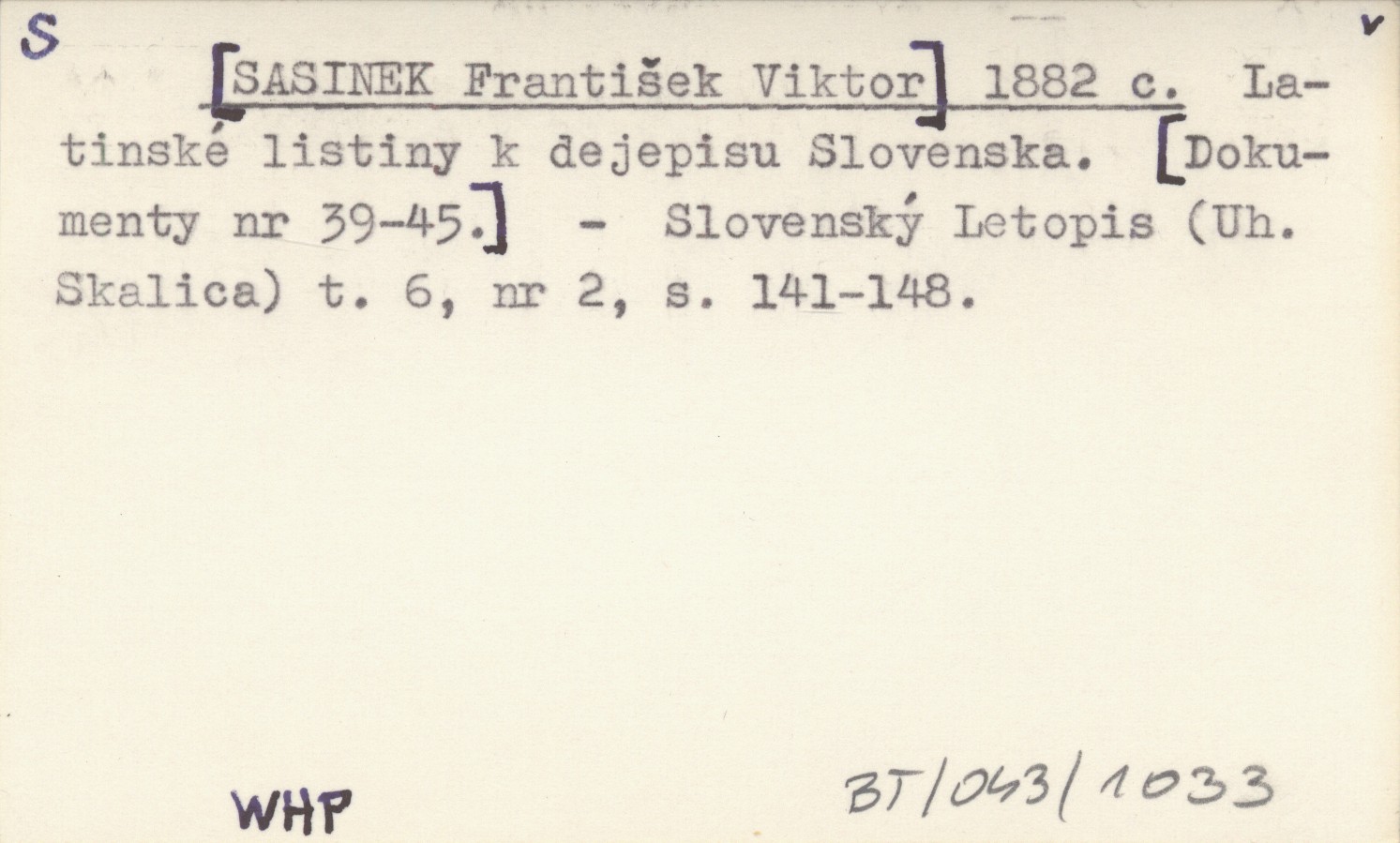 [SASINEK František Viktor] 1882 c Latinské listiny k dejepisu Slovenska. [Dokumenty nr 39-45].