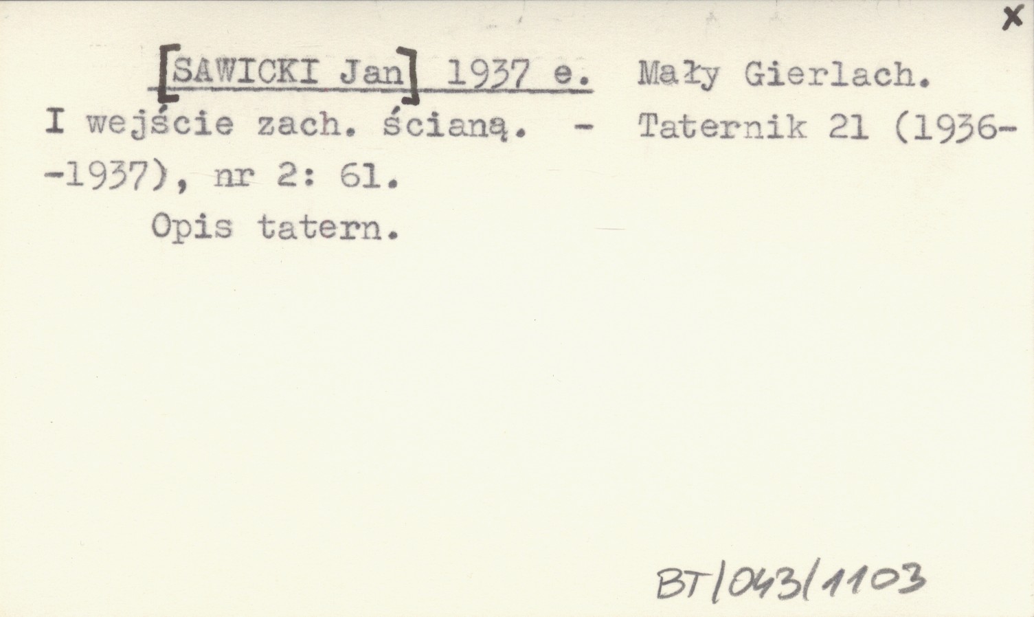 [SAWICKI Jan] 1937 e Mały Gierlach. I wejście zach. ścianą.