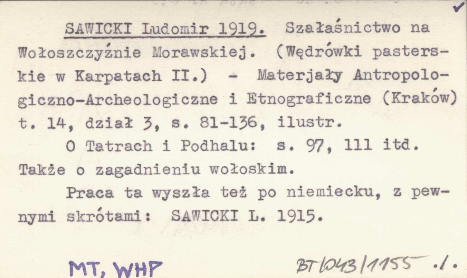 Materjały Antropologiczno-Archeologiczne i Etnograficzne (Kraków) , T. 14, dz. 3: 81-136, il. O Tatrach i Podhalu: s. 97, 111 itd. Także o zagadnieniu wołoskim. Praca ta wyszła też po niemiecku, z pewnymi skrótami: SAWICKI L. 1915 REC: KRANDŽALOV D. 1938 ; ŠTIKA J. 1961 a (s. 526, 544) ; KOPCZYŃSKA-JAWORSKA B. 1964 ;