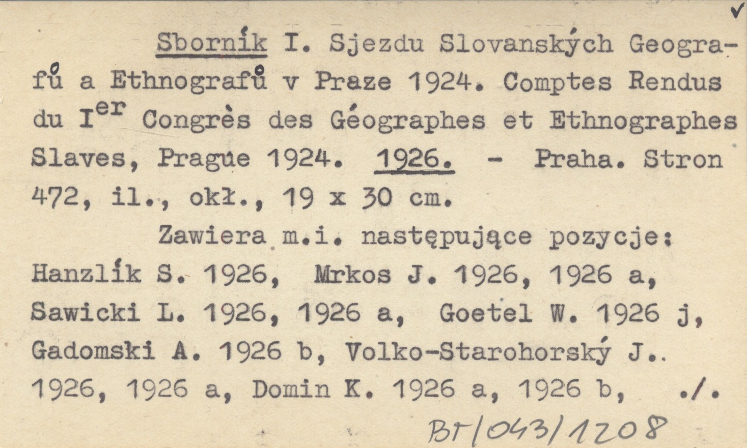 Praha , 472 s., il., okł., 19x30 cm. Zawiera m.in. następujące pozycje: Hanzlík S. 1926, Mrkos J. 1926, 1926 a, Sawicki L. 1926, 1926 a, Goetel W. 1926 j, Gadomski A. 1926 b, Volko-Starohorský J. 1926, 1926 a, Domin K. 1926 a, 1926 b, Pawłowski B. 1926 a, Wołoszyńska J. 1926, Húsek J. 1926.
