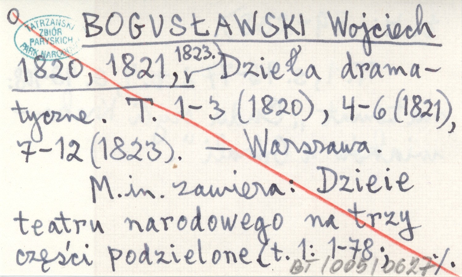 Warszawa , T. 1-3 (1820), 4-6 (1821), 7-12 (1823). M.in. zawiera: Dzieie teatru narodowego na trzy części podzielone (t. 1: 1-78; t. 4: 79-238). T. 1, s. 76-77 i t. 4, s. 98-108: na temat "Cudu czyli Krakowiaków i Górali". Też 1821, 1823.