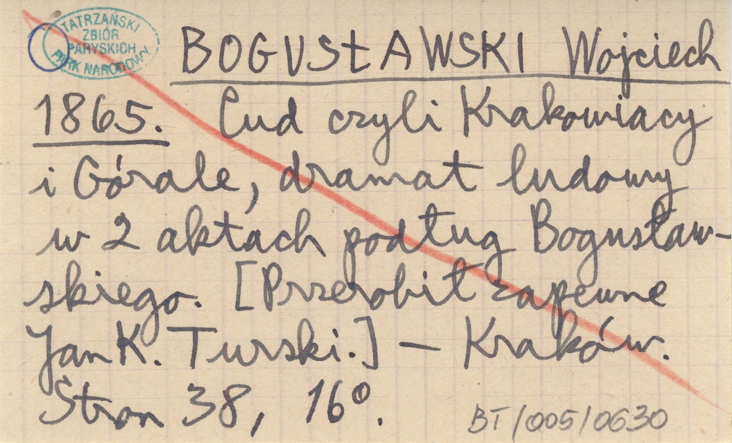 BOGUSŁAWSKI Wojciech 1865 Cud czyli Krakowiacy i Górale, dramat ludowy w 2 aktach podług Bogusławskiego. [Przerobił zapewne Jan K. Turski.].