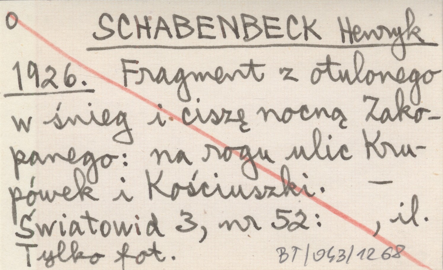 SCHABENBECK Henryk 1926 Fragment z otulonego w śnieg i ciszę nocną Zakopanego: na rogu ulic Krupówek i Kościuszki.