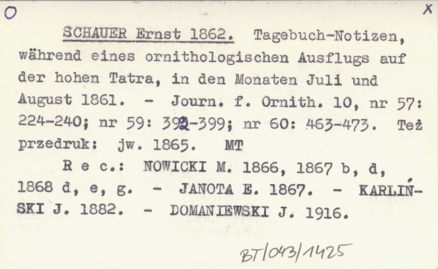 Journal für Ornithologie, 10, nr 57: 224-240 ; nr 59: 392-399 ; nr 60: 463-473. Też przedruk: jw. 1865 REC: NOWICKI M. 1866, 1867 b, d, 1868 d, e, g ; JANOTA E. 1867 ; KARLIŃSKI J. 1882 ; DOMANIEWSKI J. 1916 ;