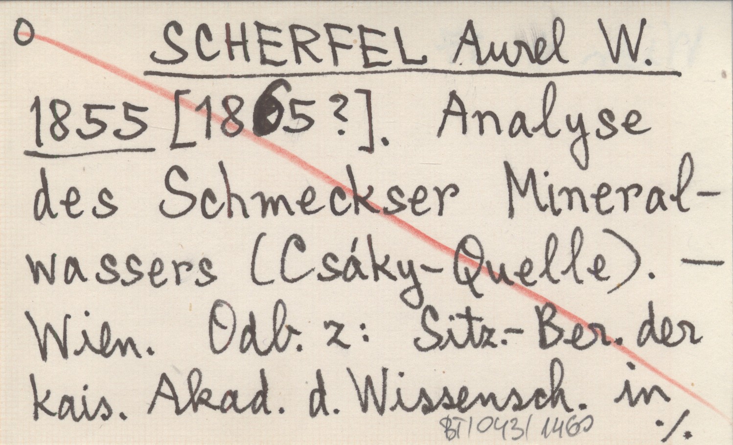 SCHERFEL Aurel W. 1855 [1865?] Analyse des Schmeckser Mineralwassers (Csáky-Quelle).