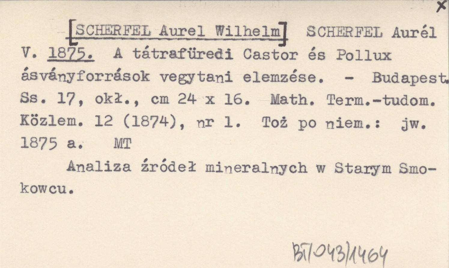 SCHERFEL Aurél V. [SCHERFEL Aurel Wilhelm] 1875 A tátrafüredi Castor és Pollux ásványforrások vegytani elemzése.