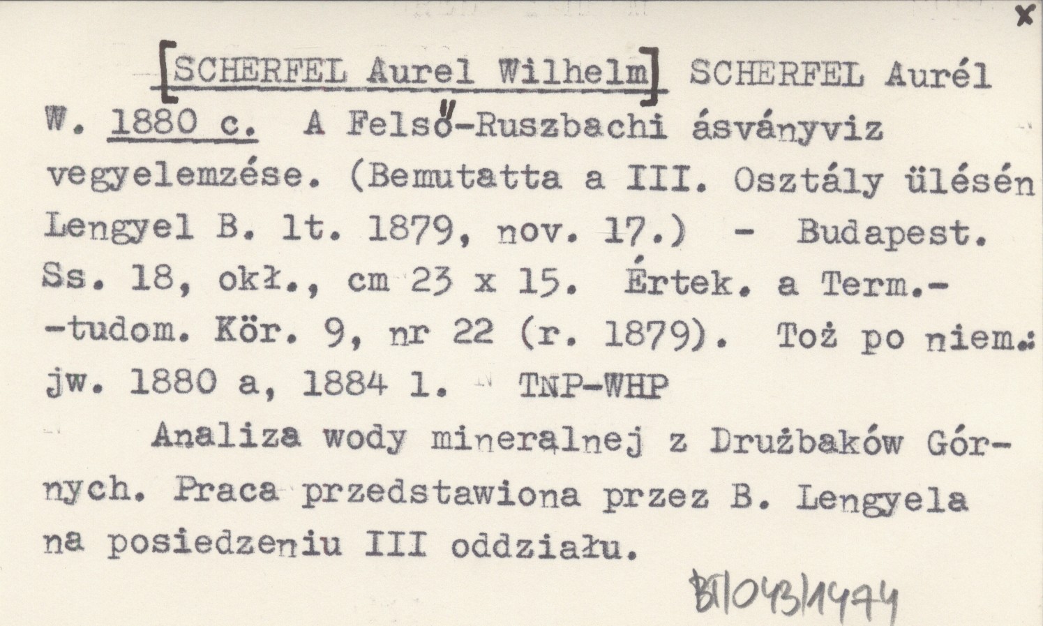 SCHERFEL Aurél W. [SCHERFEL Aurel Wilhelm] 1880 c A Felső-Ruszbachi ásványviz vegyelemzése. (Bemutatta a III. Osztály ülésén Lengyel B. lt. 1879, nov. 17.).