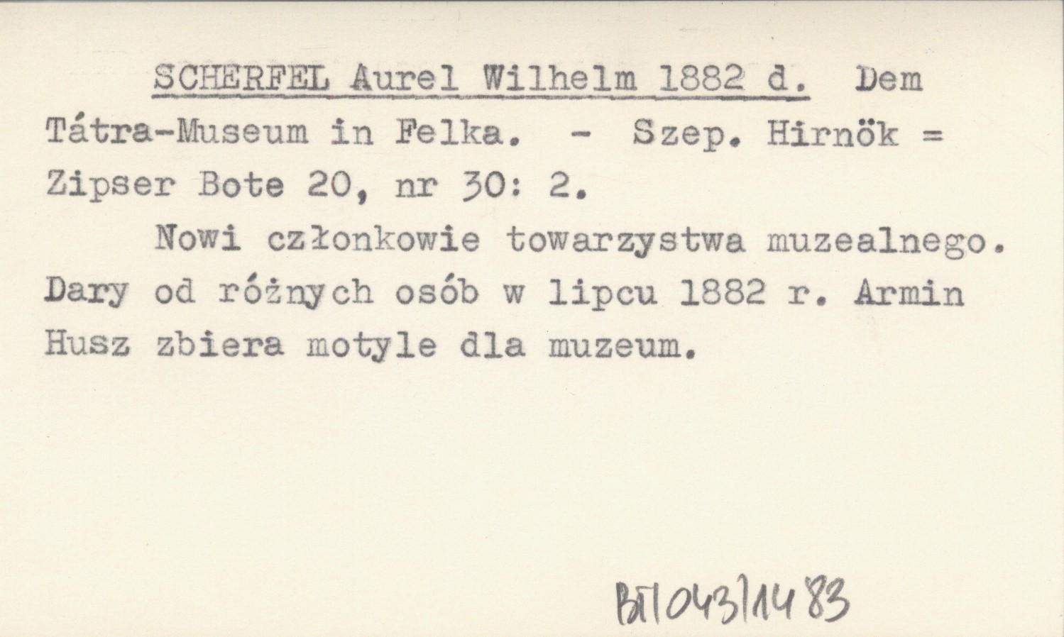 Szepesi Hirnök = Zipser Bote, 20, nr 30: 2. Nowi członkowie towarzystwa muzealnego. Dary od różnych osób w lipcu 1882 r. Armin Husz zbiera motyle dla muzeum.