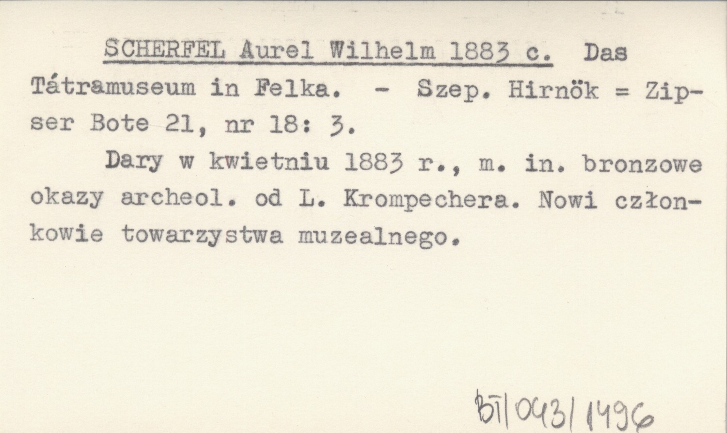 Szepesi Hirnök = Zipser Bote, 21, nr 18: 3. Dary w kwietniu 1883 r., m.in. bronzowe okazy archeol. od L. Krompechera. Nowi członkowie towarzystwa muzealnego.