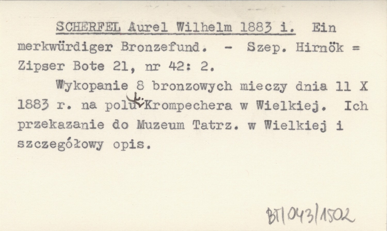 Szepesi Hirnök = Zipser Bote, 21, nr 42: 2. Wykopanie 8 bronzowych mieczy dnia 11 X 1883 r. na polu L. Krompechera w Wielkiej. Ich przekazanie do Muzeum Tatrz. w Wielkiej i szczegółowy opis.