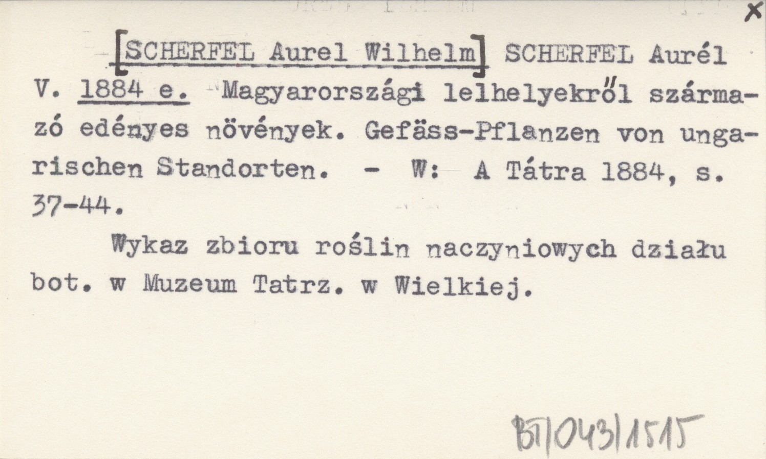 SCHERFEL Aurél V. [SCHERFEL Aurel Wilhelm] 1884 e Magyarországi lelhelyekről származó edényes növények. Gefäss-Pflanzen von ungarischen Standorten.