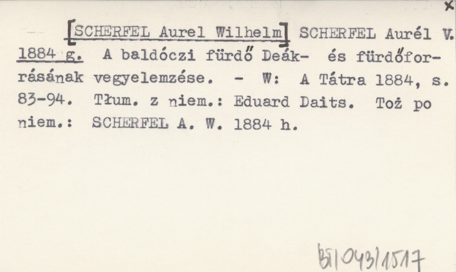 SCHERFEL Aurél V. [SCHERFEL Aurel Wilhelm] 1884 g A baldóczi fürdő Deák- és fürdőforrásának vegyelemzése.