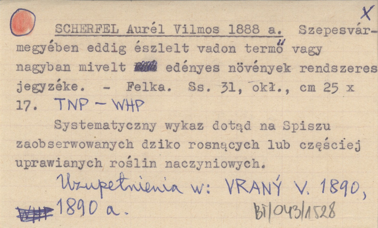 Felka , 31 s., okł., 25x17 cm. Systematyczny wykaz dotąd na Spiszu zaobserwowanych dziko rosnących lub częściej uprawianych roślin naczyniowych. Uzupełnienia w: VRANÝ V. 1890, 1890 a.