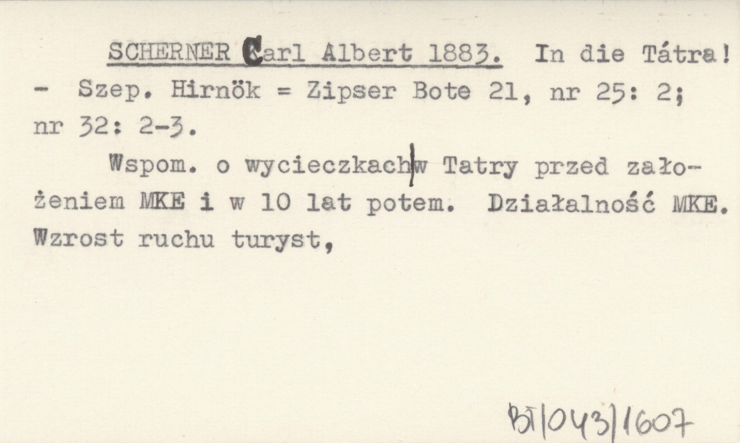 Szepesi Hirnök = Zipser Bote, 21, nr 25: 2 ; nr 32: 2-3. Wspom. o wycieczkach w Tatry przed założeniem MKE i w 10 lat potem. Działalność MKE. Wzrost ruchu turyst.